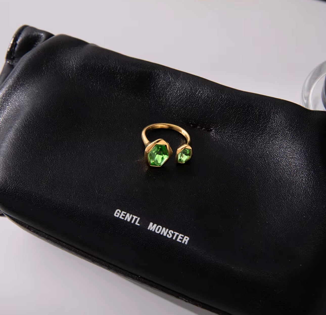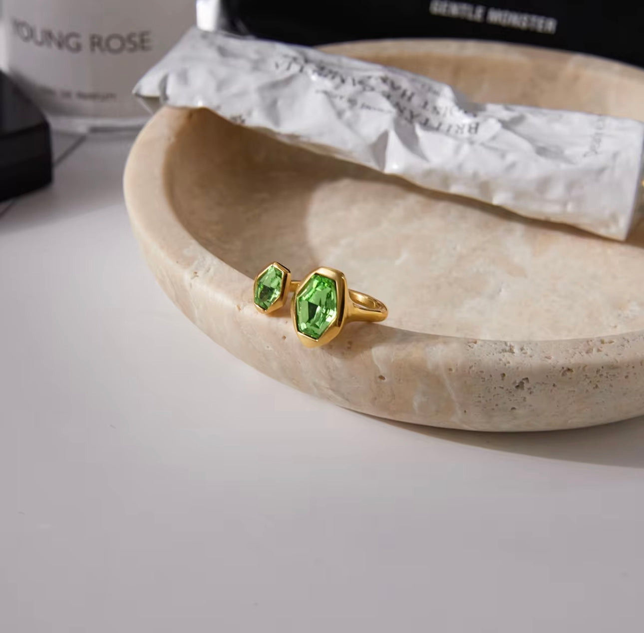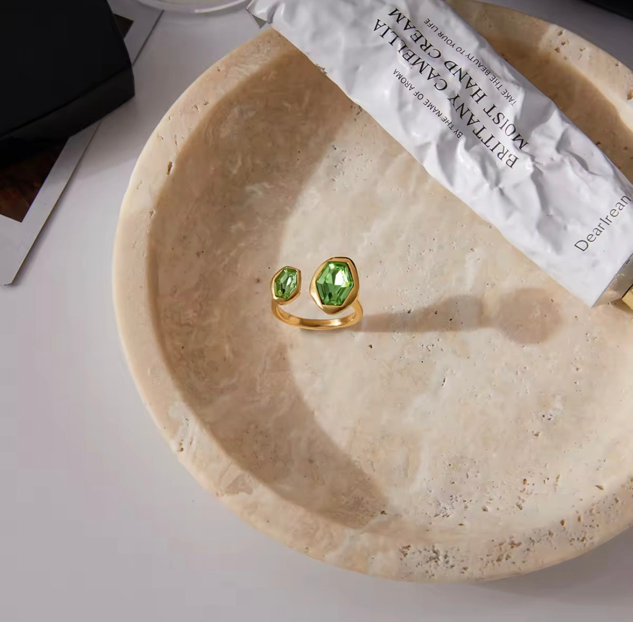 Inspired by lush green gardens and golden sunlight ☀️, the Botanica Ring brings nature to your fingertips. Two asymmetrical peridot-toned stones shine from either end of a fluid, open gold band celebrating balance, beauty, and bold expression 🌱💫.