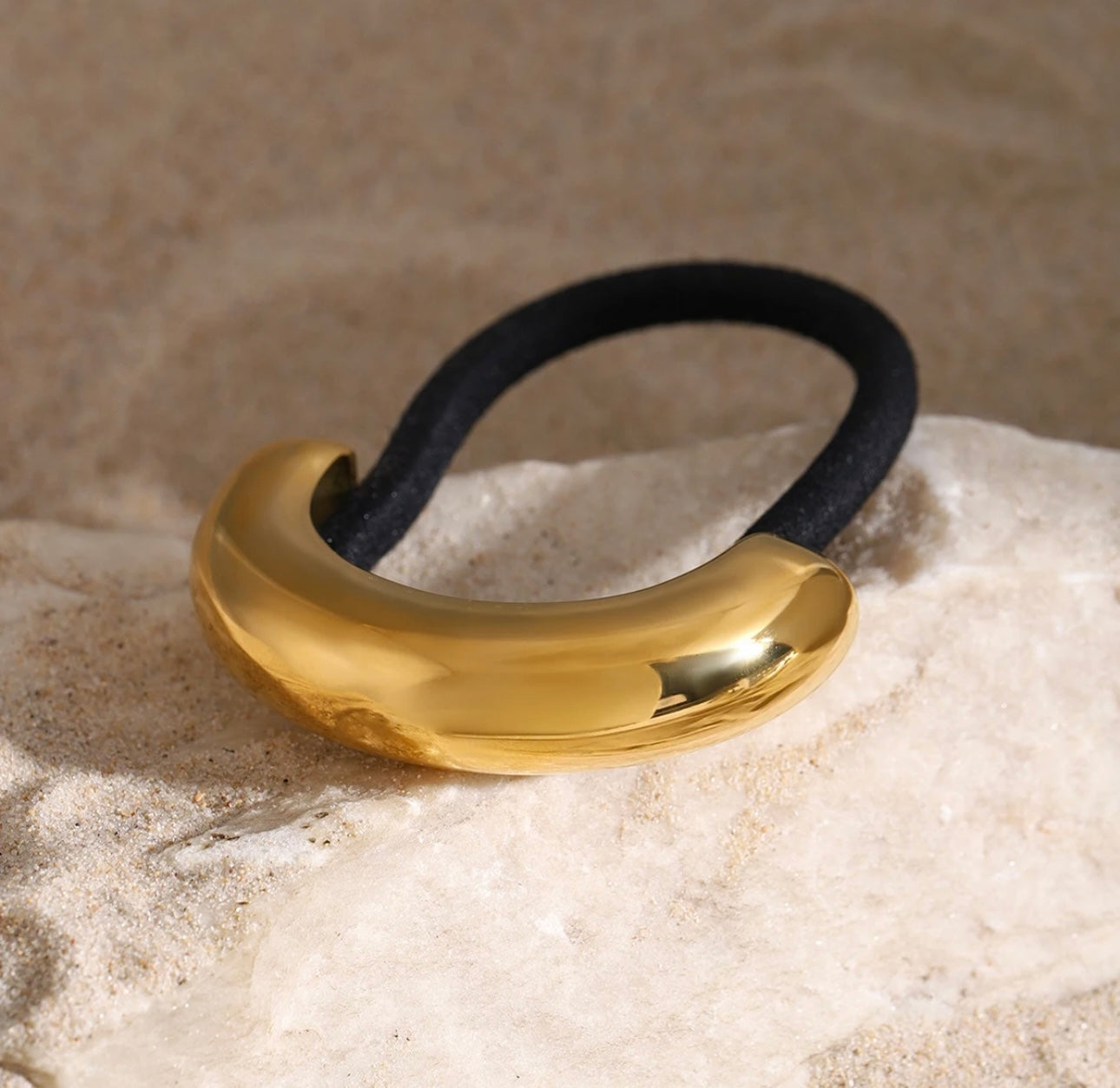 Made of stainless steel and 18k gold-plated for a luxe touch, our bold pony cuff with a high-quality black hair tie is the ultimate upgrade to any ponytail.