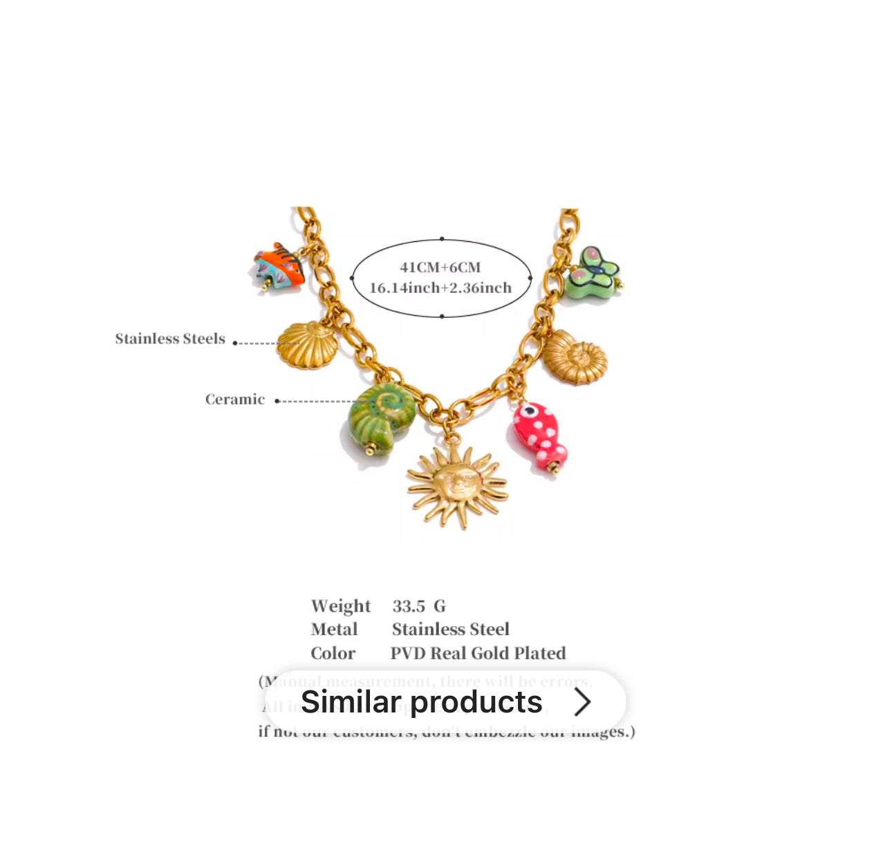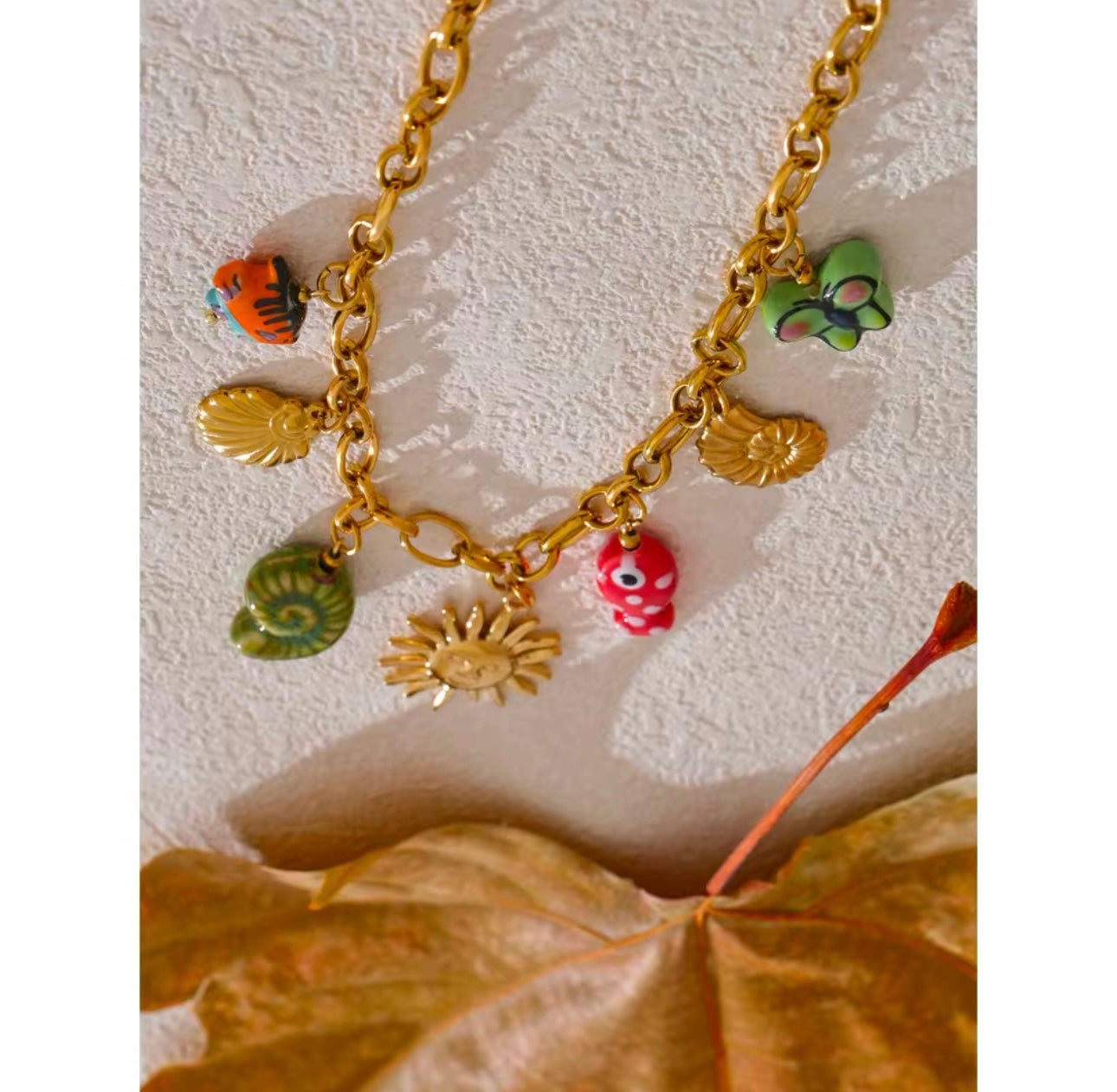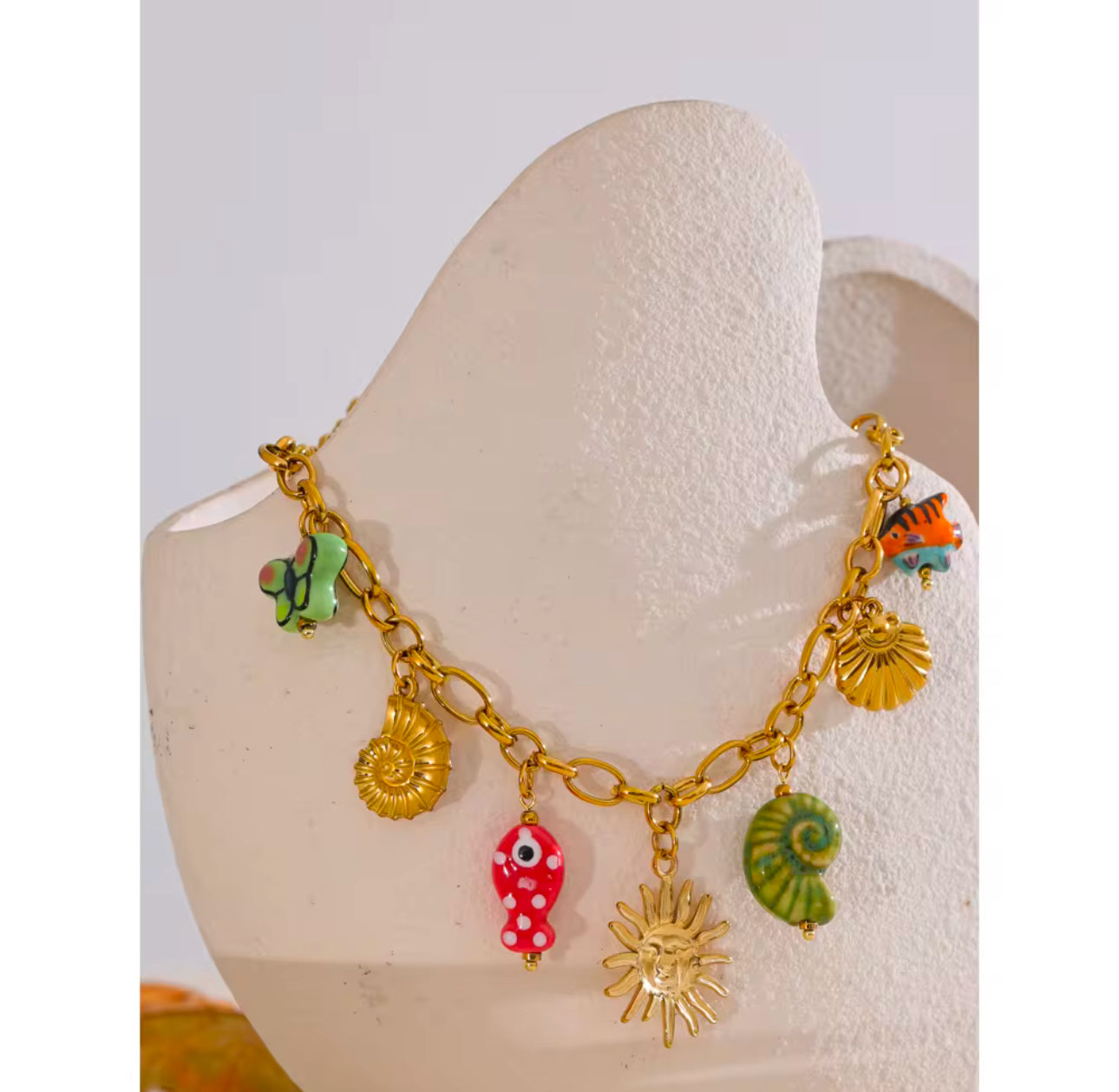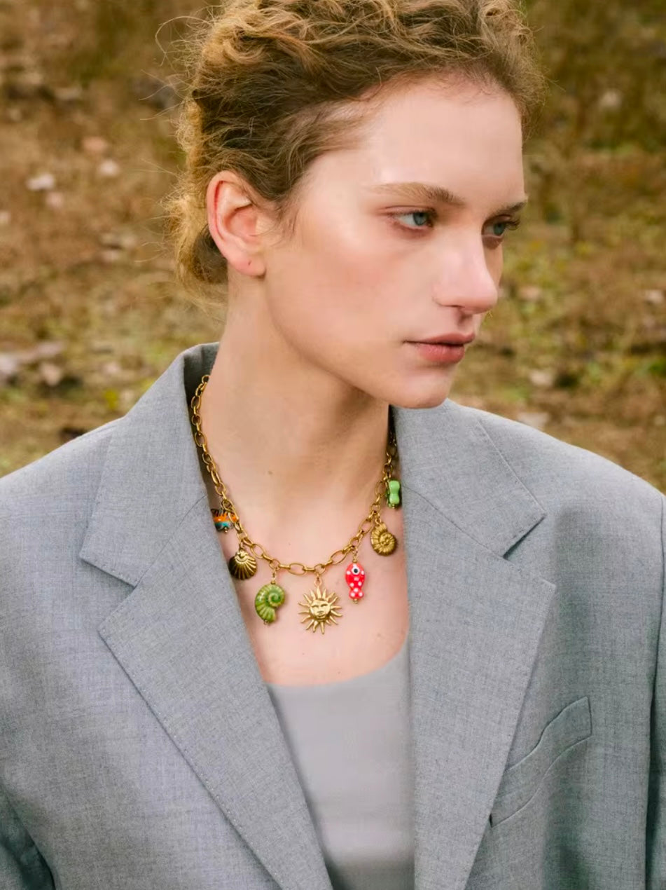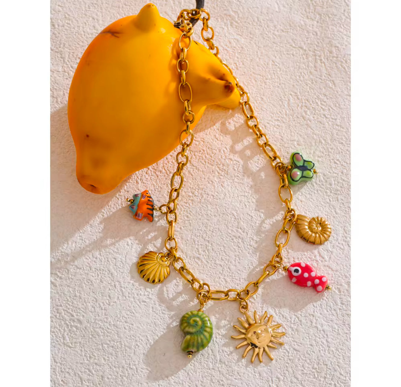 Dive into summer vibes with this playful and vibrant charm necklace! šš  Featuring a radiant sun, colorful seashells š, quirky fish š, and a cheerful butterfly š¦, it brings a burst of beachy energy to any outfit. Perfect for making a bold statement this season, this gold-tone chain with fun enamel accents will keep you shining all summer long! šāØ